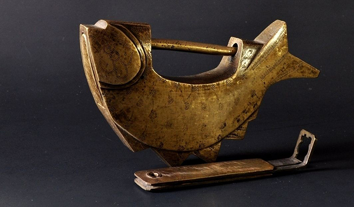 說到底,木質鎖具還不足以抵擋劇烈撞擊或者火燒。東漢時期,開始使用青銅來制作鎖體。入唐之時,古代工匠憑借過人的智慧,使用金、銀、銅、鐵等全金屬材質制鎖。直至明朝,遂發展為廣鎖、花旗鎖、首飾鎖、刑具鎖四大類。古鎖工藝精致奧妙,文化內涵豐富,人們時常在鎖體上雕花刻字,寓意深遠,尤以魚形鎖為例,《芝田錄》中記載:“門鎖必為魚者,取其不暝守夜之意。”