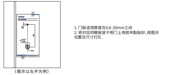 2. 將對應的模板放于柜門上用膠布黏貼好,按圖示位置及尺寸打孔
