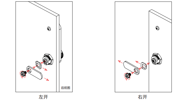 2、在確定鎖具安裝方向后,需要判斷鎖具尺寸與柜子是否合適,門板的厚度,鎖具需要左開門還是右開門,以確定鎖舌安裝方向。