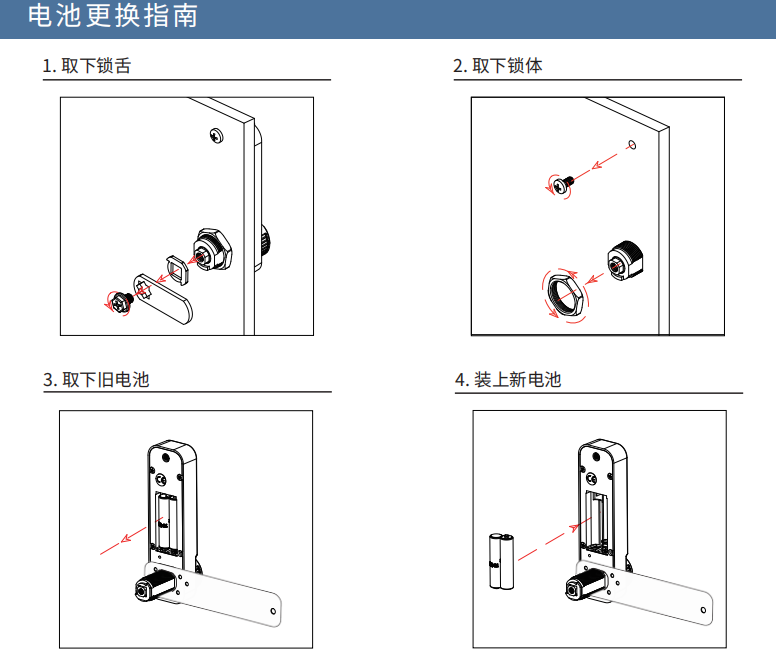 經過以上步驟,密碼轉舌鎖的安裝就完成啦。不過,對電子密碼鎖來說,更換電池是常有之事。由于目前多數電子密碼鎖采用的是一體式設計,電池更換時也需要我們將整個鎖具取下來。因此,熟悉密碼轉舌鎖的安裝步驟,也有助于我們更換電池哦!