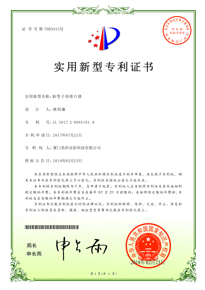 美科子母排片鎖轉(zhuǎn)舌鎖舌片鎖M1-LOCK,是美科實用新型專利鎖具之一(M1-LOCK專利號:ZL 2017 2 0895181.8)。屬于熱銷經(jīng)典款。設(shè)計巧妙,集多重安全結(jié)構(gòu)于一體,牙花可高達100億,鑰匙形狀新穎美觀,因其安裝簡便,安全性高,價格適中,使用范圍廣泛,又被稱之為抽屜鎖,家具鎖,寄存柜鎖,信箱鎖,ATM機鎖等,是最常見的工業(yè)鎖具和商用鎖具之一。
